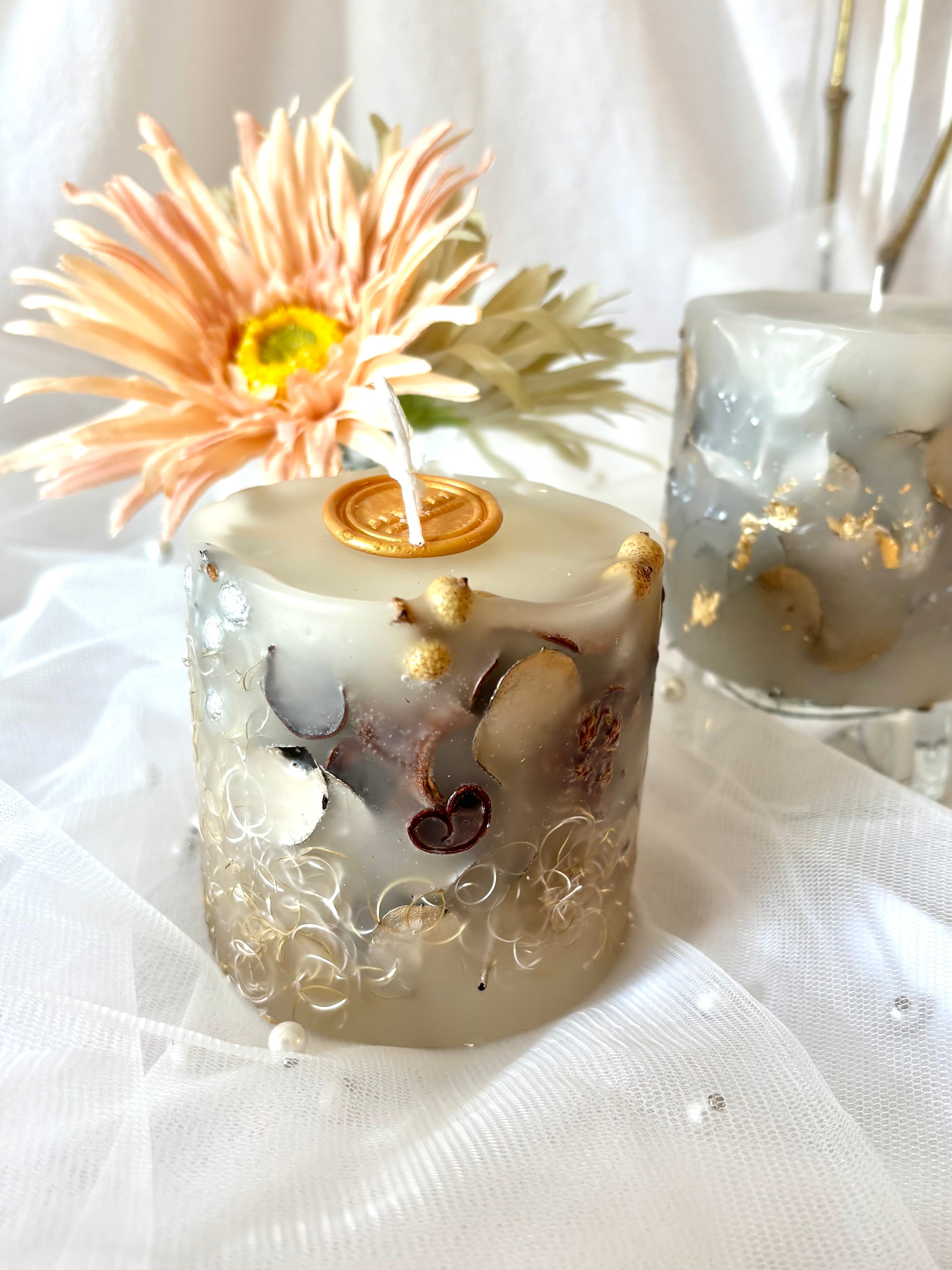 ドライフラワーや木の実を閉じ込め、灯す前からインテリアとして楽しめるオシャレなデザインに仕上げました。